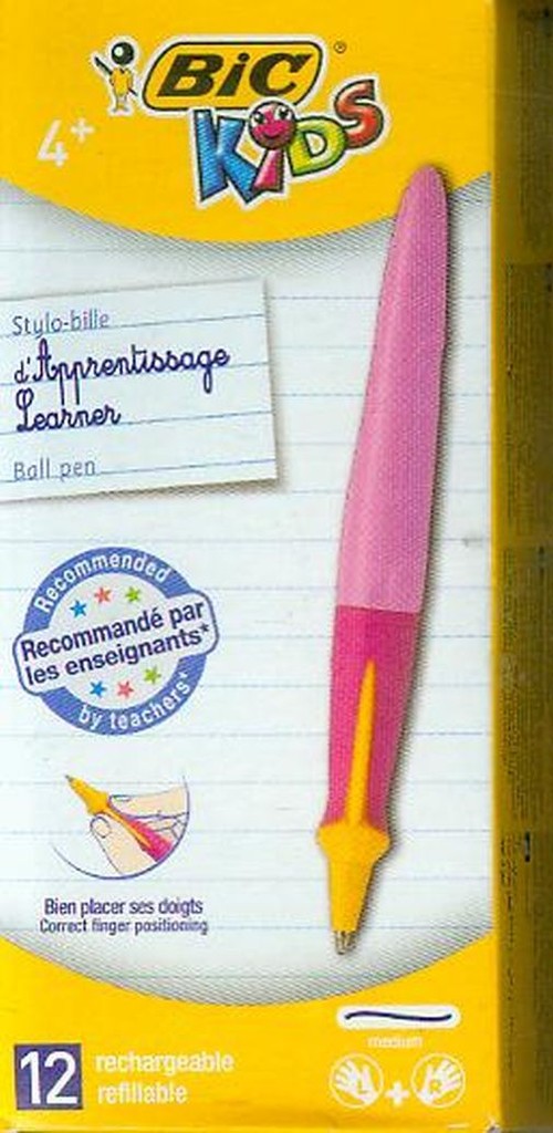 Długopis automatyczny. Przydatny w procesie uczenia się. Wymienny wkład. Zawiera 1 dodatkowy wkład. Widoczna linia wskazująca właściwe położenie palca. Dla lewo i praworęcznych. Szerokość pisma 1,0 mm. Niebieski tusz. Kod kreskowy na każdym długopisie.