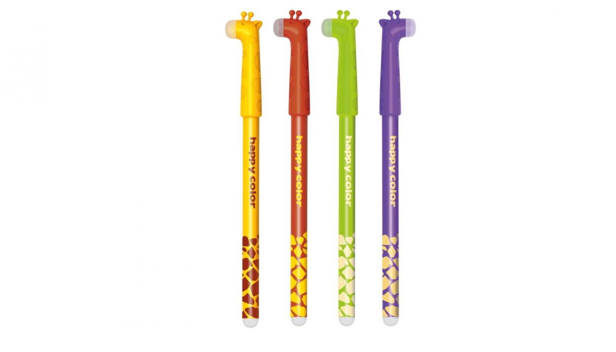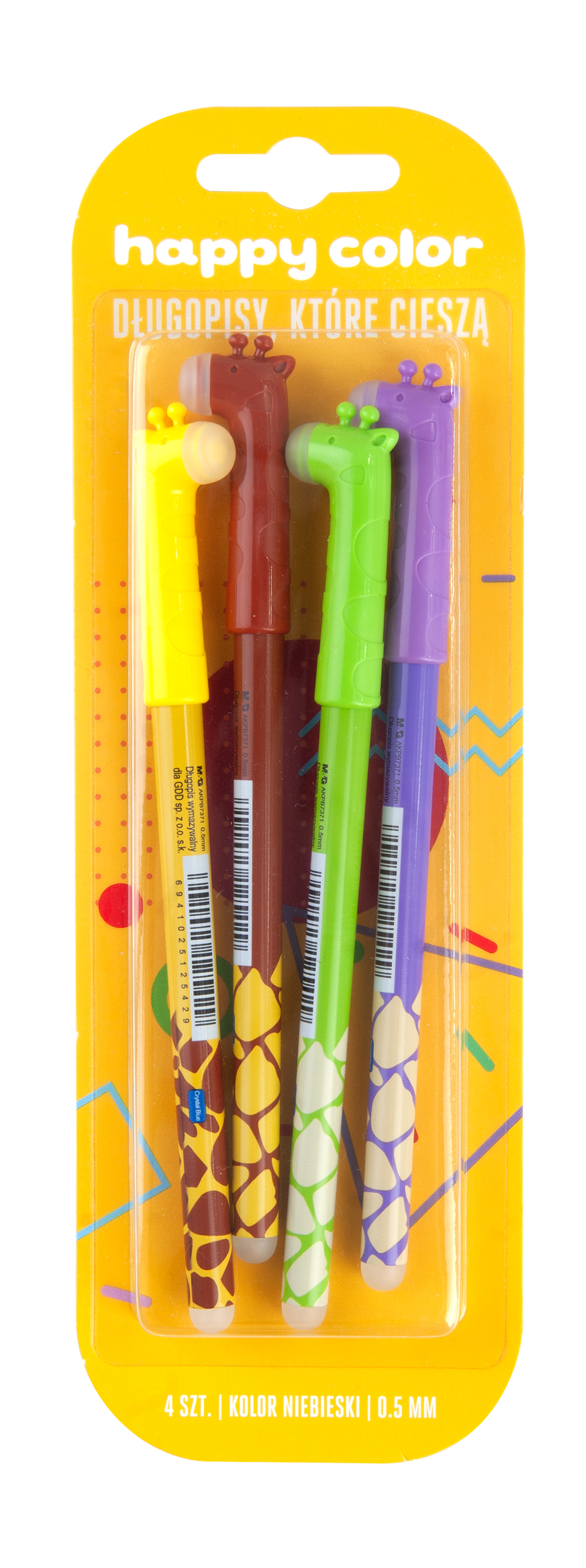 Długopis usuwalny Żyrafy, 0.5mm, niebieski, kolorowa obudowa, 4 sztuki na blistrze, Happy Color.