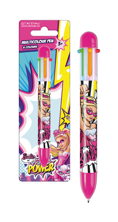 Wielokolorowy długopis automatyczny z gripem ułatwiającym pisanie. Zdobiony atrakcyjnym motywem.