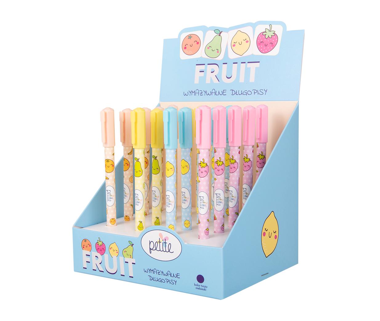 Kolorowe długopisy wymazywalne z motywem owocowym. Dzięki swojemu oryginalnemu wyglądowi, długopisy będą nadawać uroku piórnikowi oraz przybornikowi. Długopis wymazywalny, mix wzorów, 20 sztuk w opakowaniu.