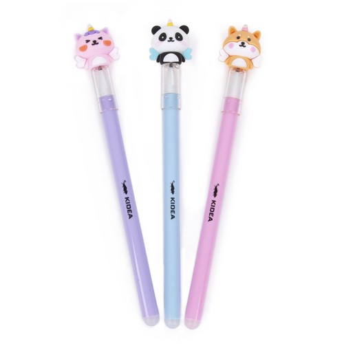 Długopis wymazywalny z figurką w kształcie zwierzaka. Zatyczka długopisu ozdobiona słodkim motywem uatrakcyjnia produkt i sprawia, że dzieci czerpią ogromną radość z jego użytkowania. Dodatkowo figurki ozdobione skrzydełkami i rogiem jednorożca. Długopis wymazywalny idealnie sprawdzi się w szkole, a dzięki gumce, znajdującej się na końcu długopisu wymażemy każdy popełniony podczas pisania błąd. Precyzyjna końcówka sprawia, że pisanie nim to czysta przyjemność. Posiada niebieski wymienny wkład (0,7 mm).