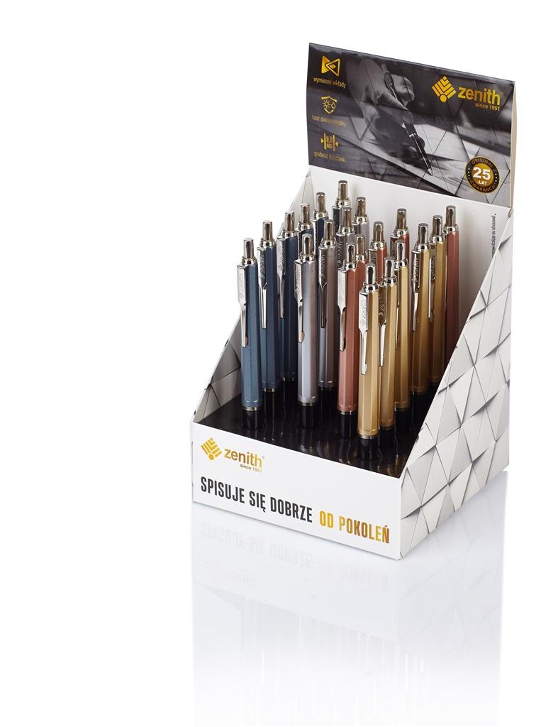 Długopis automatyczny z nikowanymi elementami. Korpus wykonany z błyszczącego tworzywa sztucznego. Obudowa dzielona w 1/3 wysokości (górna część ośmiokątna) obie części korpusu oddzielone mosiężno-niklowaną obrączką. Wymienny wkład wielkopojemny Zenith 4 z dokumentalnym tuszem w kolorze niebieskim gwarantującym trwałość zapisu. Długość linii pisania 4500 metrów. Kolory: złoty, srebrny, miedziany, niebieski.
