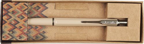 Długopis automatyczny o korpusie z błyszczącego tworzywa sztucznego, obudowa dzielona w 1/3 wysokości (górna część ośmiokątna), obie części korpusu oddzielone mosiężno-niklowaną obrączką, metalowe elementy dolnej części korpusu trwale związane z elementami plastikowymi wymienny wkład wielkopojemny Zenith 4, tusz dokumentalny w kolorze niebieskim gwarantujący trwałość zapisu.