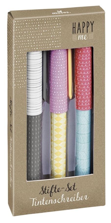 Zestaw trzech długopis kulkowe ze skuwką. Dwa długopisy z niebieskim wkładem a jeden z wkładem czarny. Wysokość 13,5 cm.