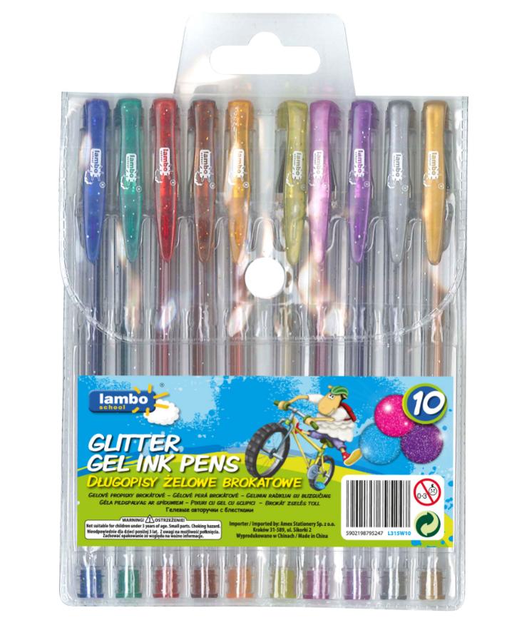Długopisy żelowe brokatowe w 10 intensywnych kolorach. W plastikowej, przezroczystej obudowie, umożliwiającej kontrolę zużycia tuszu. Pakowane w plastikowe etui. Długość linii: >150 m, grubość linii pisania: 0,7 mm.