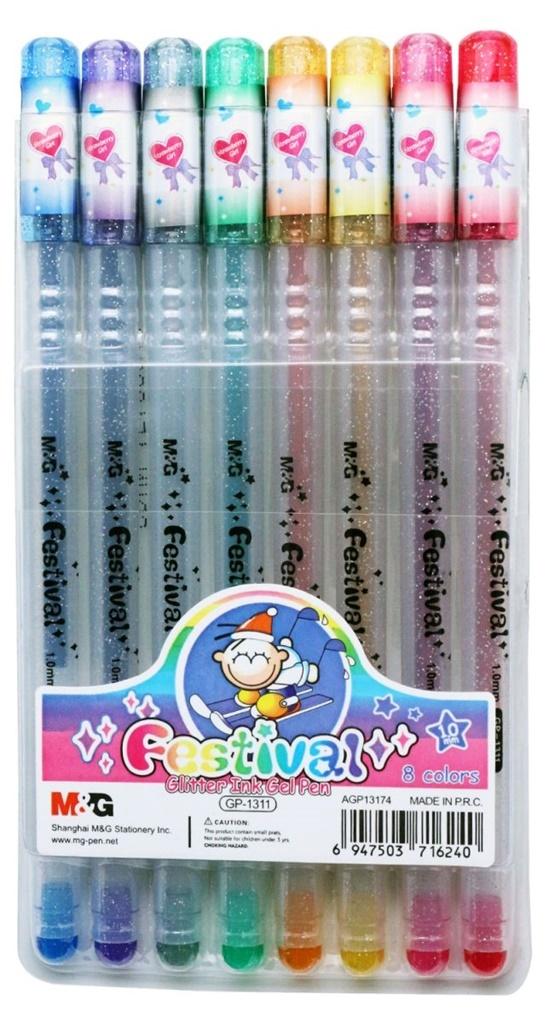 Zestaw 8 długopisów żelowych z kolorowym tuszem z brokatem.