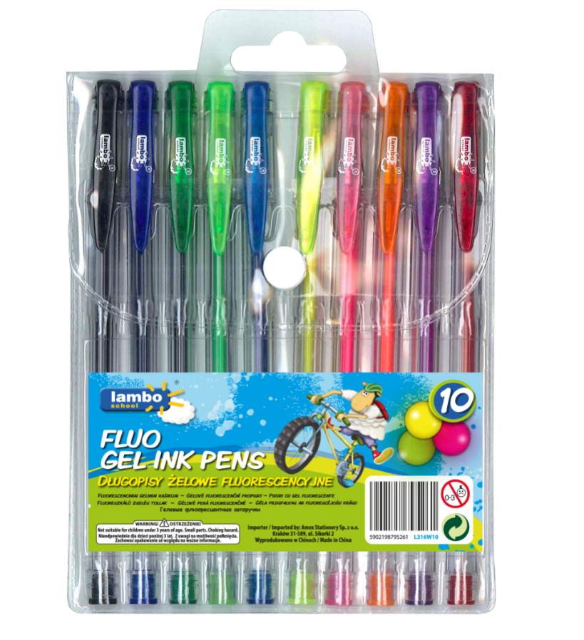 Długopisy żelowe fluorescencyjne w 10 intensywnych kolorach. W plastikowej, przezroczystej obudowie, umożliwiającej kontrolę zużycia tuszu. Pakowane w plastikowe etui. Długość linii: >150 m, grubość linii pisania: 0,7 mm.