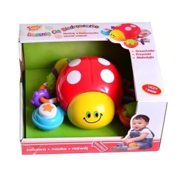 Kolorowa biedronka Smily Play to wesoła zabawka dla dzieciaków w wieku powyżej 6 miesiąca życia. Biedroneczka ucieka, kiedy dziecko naciśnie na jej grzbiet - specjalny mechanizm wprawia ją w ruch.