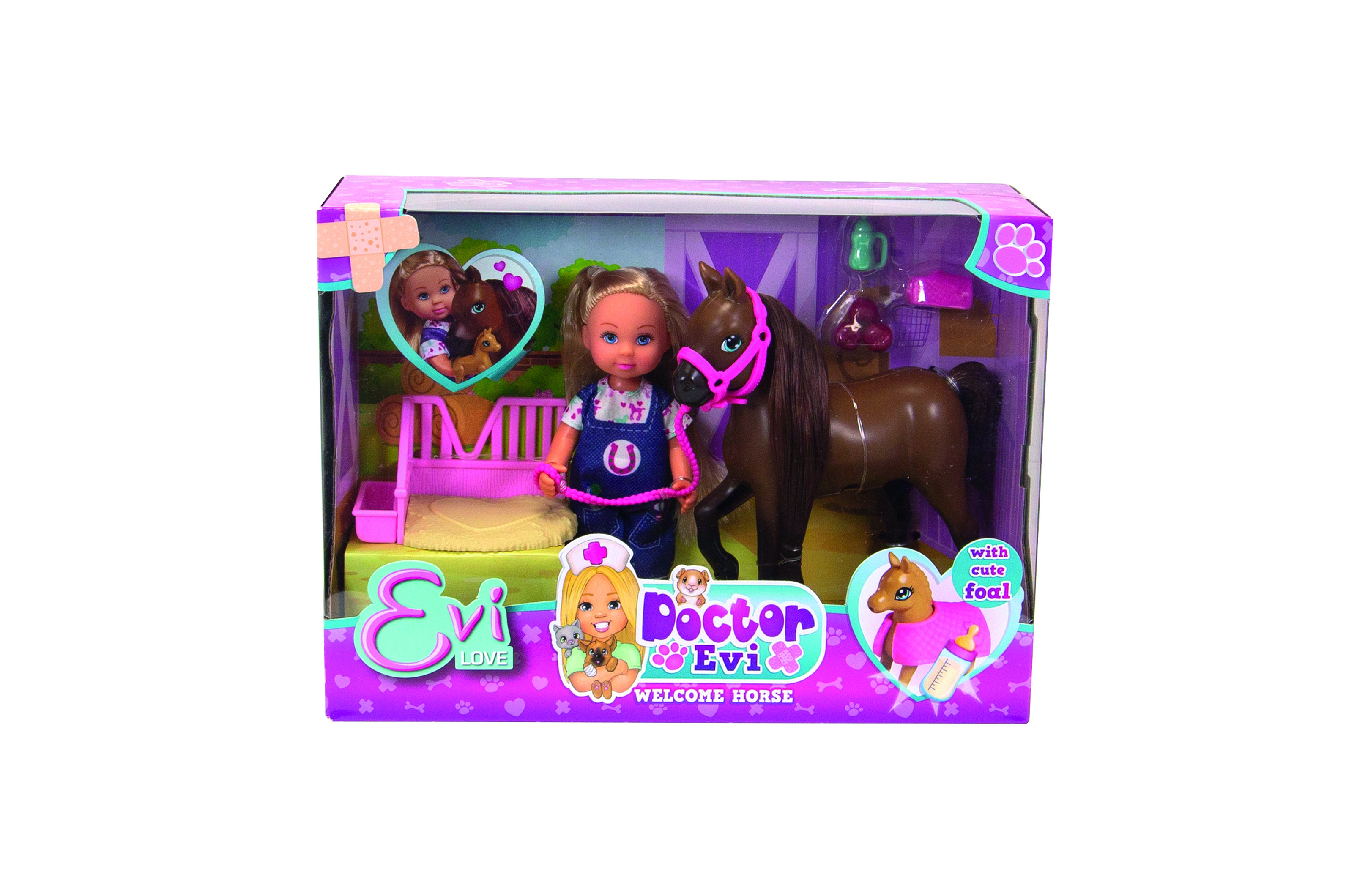 Dziewczynki lubią wcielać się w zawodowe role, zabawa w weterynarza to świetny sposób na zdobywanie nowych umiejętności i empatii dla zwierząt. Evi pomaga w narodzinach źrebaka, który mieści się w brzuchu klaczy. Zabawę dopełniają niezbędne dodatki jak kojec, pled i buteleczka dla źrebaka. Evi troskliwie karmi źrebaka butelką, którą można precyzyjnie mocować w rączkach laleczki za pomocą wypustek. Laleczka ma zginane w kolanach nóżki i ruchome nadgarstki.