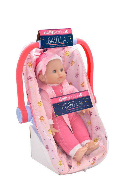 Lalka o wielkości 30cm w nosidełku z rączką, która umożliwia łatwe jej przenoszenie. Posiada śpiące oczka oraz urocze ubranko.