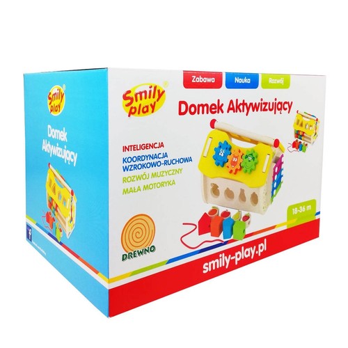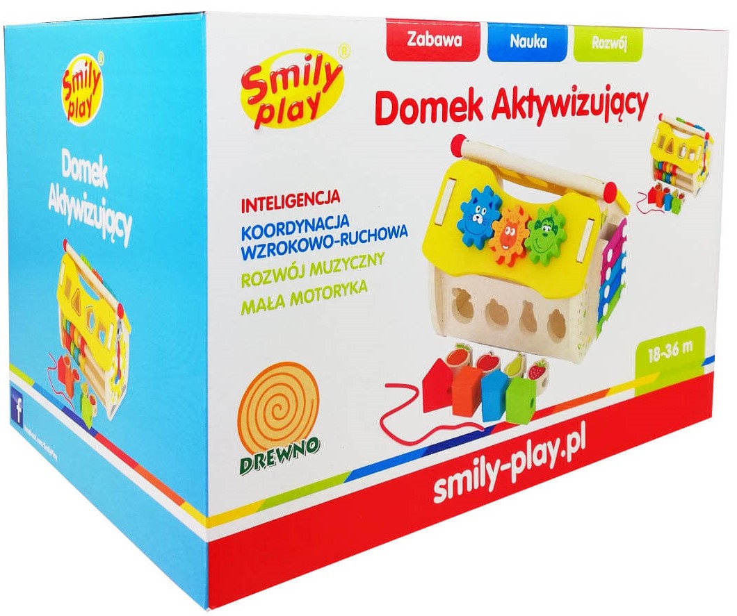 Na każdej ścianie domku dziecko znajdzie inną zabawę: elementy do przesuwania, obrotowe zębatki, sorter, cymbałki, zegar z ruchomymi wskazówkami i zębate koła. Dodatkową atrakcją zabawki są klocki do nawlekania.