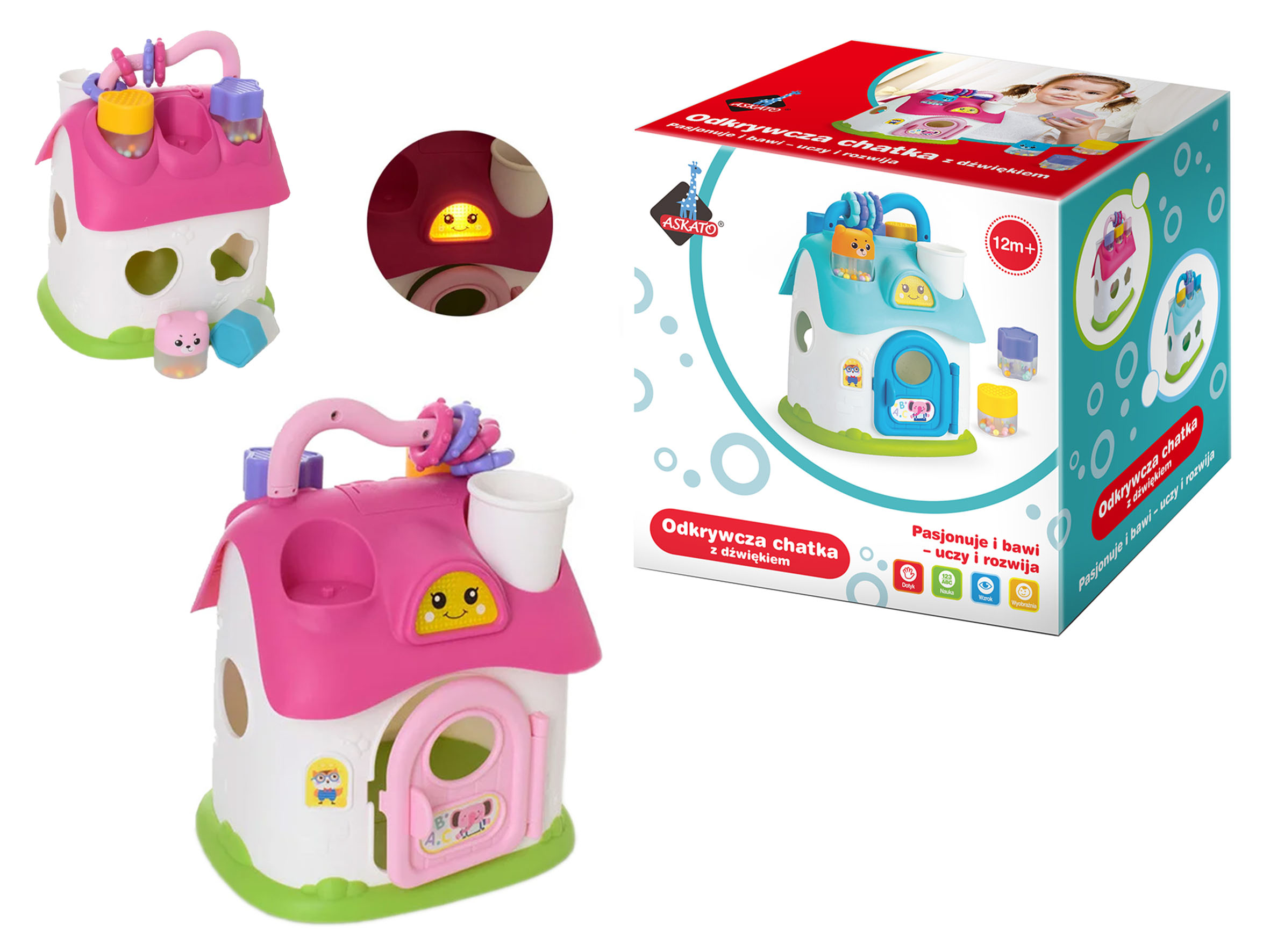 Mix kolorów. Towar wysyłany losowo. Cena za pojedyńczą sztukę. Domek 20x18x16,5 ze światełkiem, w zestawie z klockami, grzechotkami i kluczykiem. Zabawka zasilana 2 bateriami AAA, nie dołaczone do zabawki.