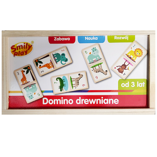 Gra Domino to jedna z pierwszych gier planszowych dla malucha. Ma charakter edukacyjny, bo bawiąc się, dziecko uzupełnia słownictwo, uczy się kolorów, ćwiczy uważność, logiczne myślenie. Dziecko uczy się gry w zespole, przyswaja pojęcie sekwencji ruchów.Gracze układają kostki w długie łańcuchy, a wygrywa ten z nich, który jako pierwszy pozbędzie się wszystkich swoich kostek. Trwałe drewniane opakowanie, kolorowe obrazki na kostkach sprawiają, że gra się łatwo nawet najmłodszym, początkujących graczy nie odstraszą także proste zasady gry.