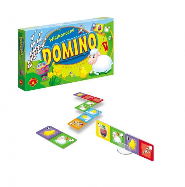 Domino Wielkanoc"" to kolorowa wersja domina, złożona z obrazków o tematyce wielkanocnej. W trakcie gry, każdy jej uczestnik stara się dołożyć jeden ze swoich elementów do układu leżącego na stole. Elementy dokłada się dopasowując ze sobą ich obrazki. Zwycięzcą zostaje ten, kto pierwszy pozbędzie się swojej puli elementów. Zawartość opakowania: 28 elementów domina, 10 plastikowych podstawek, instrukcja.