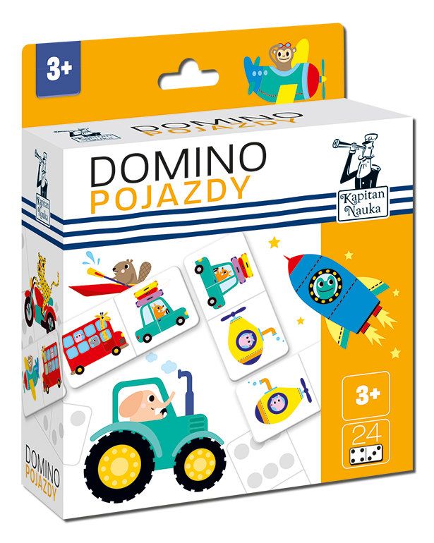 Domino Pojazdy (3+) to prosta gra logiczna dla dzieci od 3. roku życia. Trenuje myślenie i spostrzegawczość zadaniem graczy jest połączenie w pary rysunków takich samych środków transportu (dla utrudnienia rysunki są w lustrzanym odbiciu).