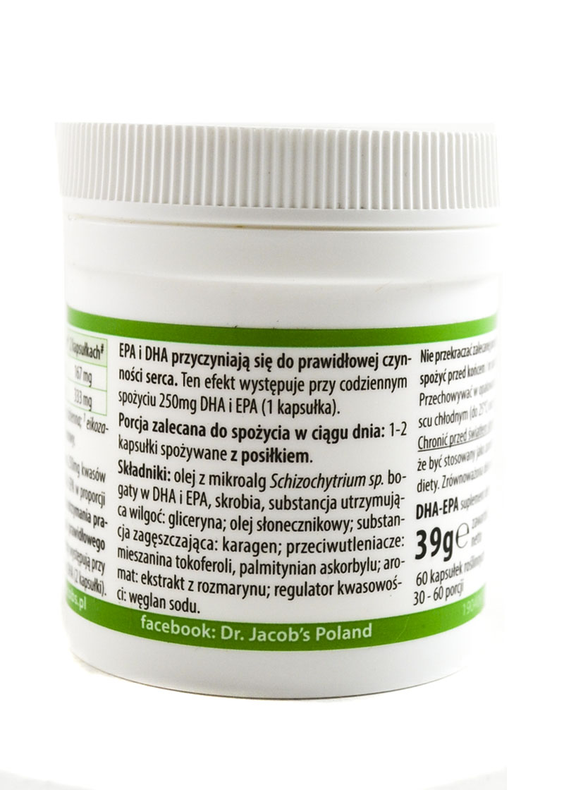 Nienasycone kwasy tłuszczowe DHA (kwas dokozaheksaenowy) i EPA (kwas eikozapentaenowy) to jedne z niezbędnych składników budulcowych są niezastąpionymelementem konstrukcyjnym wszystkich komórek organizmu. Należy je dostarczać z pożywieniem, ponieważ organizm nie ma zdolności wytwarzania w odpowiedniej ilości tych kwasów. Suplementacja DHA jest szczególnie ważna przy spożywaniu niewielkiej ilości ryb (główne źródło DHA). DHA-EPA to jeden z niewielu produktów na rynku, które mogą stosować także wegetarianie i weganie. Algi są zdrową, roślinną alternatywą jako źródło ważnych dla zdrowia kwasów tłuszczowych Omega-3. Olej w DHA-EPA uzyskany jest z mikroalg Schizochytrium. Tylko jedna kapsułka DHA-EPA zawiera aż 250mg kwasów DHA i EPA w proporcji 2:1 (ok. 166,6 mg DHA, ok. 83,3 mg EPA).