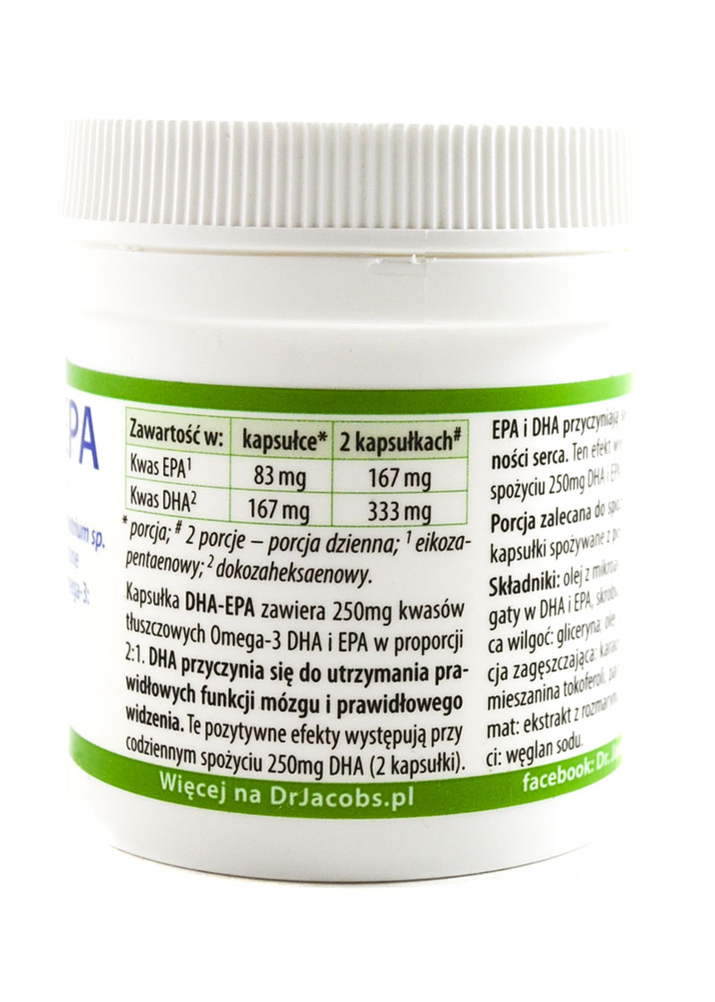 Nienasycone kwasy tłuszczowe DHA (kwas dokozaheksaenowy) i EPA (kwas eikozapentaenowy) to jedne z niezbędnych składników budulcowych są niezastąpionymelementem konstrukcyjnym wszystkich komórek organizmu. Należy je dostarczać z pożywieniem, ponieważ organizm nie ma zdolności wytwarzania w odpowiedniej ilości tych kwasów. Suplementacja DHA jest szczególnie ważna przy spożywaniu niewielkiej ilości ryb (główne źródło DHA). DHA-EPA to jeden z niewielu produktów na rynku, które mogą stosować także wegetarianie i weganie. Algi są zdrową, roślinną alternatywą jako źródło ważnych dla zdrowia kwasów tłuszczowych Omega-3. Olej w DHA-EPA uzyskany jest z mikroalg Schizochytrium. Tylko jedna kapsułka DHA-EPA zawiera aż 250mg kwasów DHA i EPA w proporcji 2:1 (ok. 166,6 mg DHA, ok. 83,3 mg EPA).3