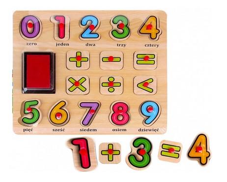 Drewniana układanka z cyferkami i symbolami matematycznymi. Każdy element jest jednocześnie stempelkiem. W komplecie znajduje się także poduszeczka z tuszem,