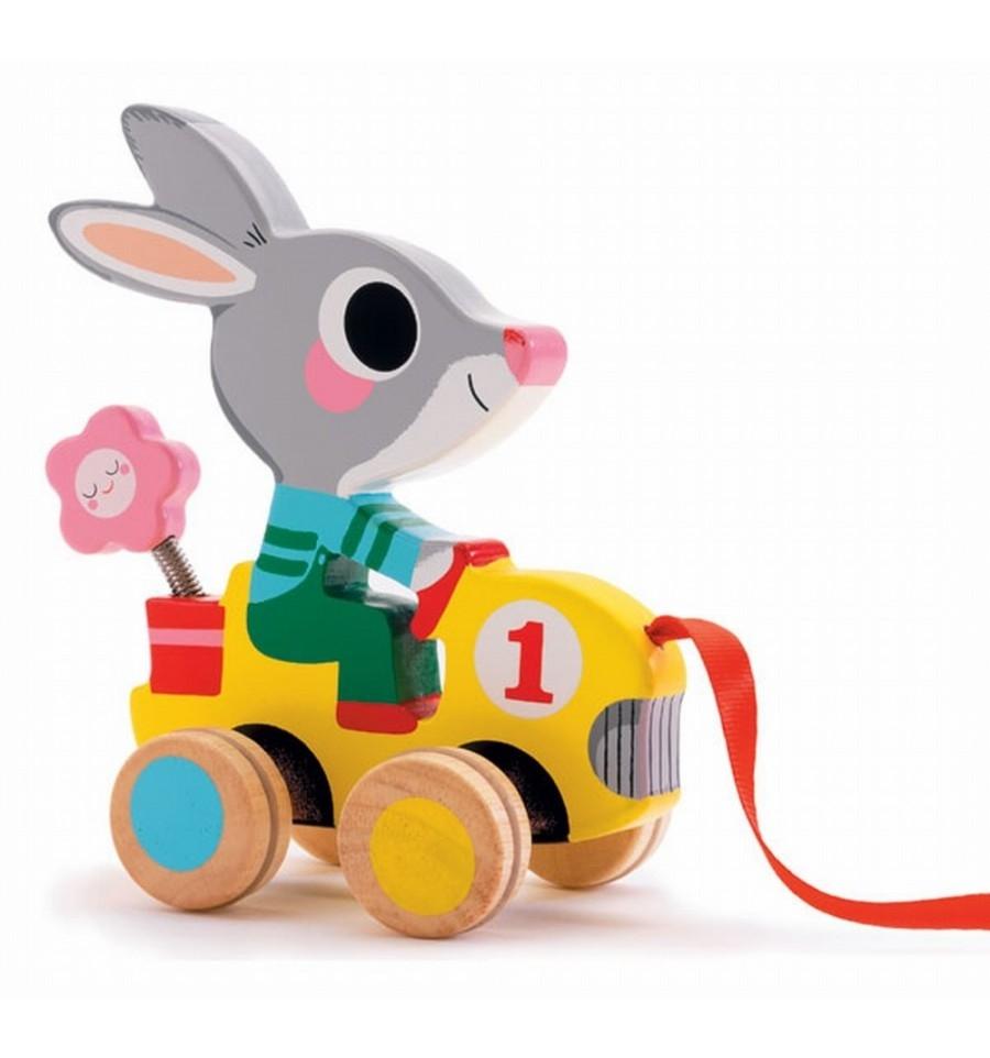 Drewniany królik do ciągnięcia na sznurku. Malutki kwiatek w bagażniku w czasie poruszania zabawki lekko się trzęsie