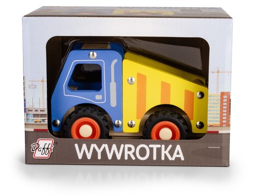 Drewniany pojazd budowlany rozbudzi ciekawość i chęć zabawy każdego dziecka. Wywrotka malowana bezpieczną na dzieci farbą, opony wykonane są z miękkiej gumy.