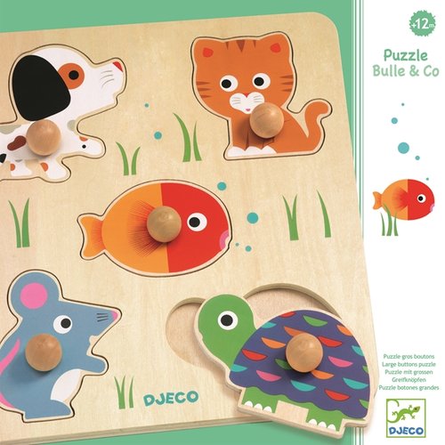 Drewniane puzzle kształtowe dla najmłodszych dzieci. Zadaniem dziecka jest dopasowanie danego zwierzątka do właściwego kształtu. Uchwyty na każdym klocku sprawiają, ze małym rączkom niezwykle łatwo je chwycić. Uczą koordynacji oko-ręka, pomagają ćwiczyć sprawność i precyzje małej rączki i są idealnym sposobem aby wzbogacać słownictwo, gdyż nie ma nic przyjemniejszego niż opowieści podczas układania puzzli. Puzzle wykonane są z drewna.
