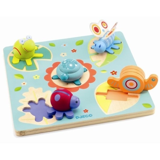 Drewniane puzzle Żółw i przyjaciele to wspaniałe i kolorowe drewniane puzzle dla najmłodszych. Żółwik, ślimak, żabka, biedronka i motylek tworzą mały ogródek w którym twoje dziecko pozna świat przyrody. Niezwykle pomysłowe trójwymiarowe postacie zwierzątek są niezwykle łatwe do chwytania dla małych rączek. Zabawka pobudza wyobraźnię i wyrabia zręczność paluszków. Wymiary: 22,6x22,6x6cm Wiek dziecka : 1 +