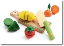 Zestaw drewnianych warzyw do krojenia ( części warzyw połączone ze sobą na rzep ). W zestawie: deska nóż cytryna pomarańcza pomidor gruszka. Walory edukacyjne:poznawanie warzyw,owoców i ich odróżnianie,ćwiczenie motoryki małej dłoni,nauka odwzorowywania tego co zaobserwuje dziecko w otaczającym go realnym świecie. Wiek: +3 lata Wielkość opakowania: 22x20x4,5 cm