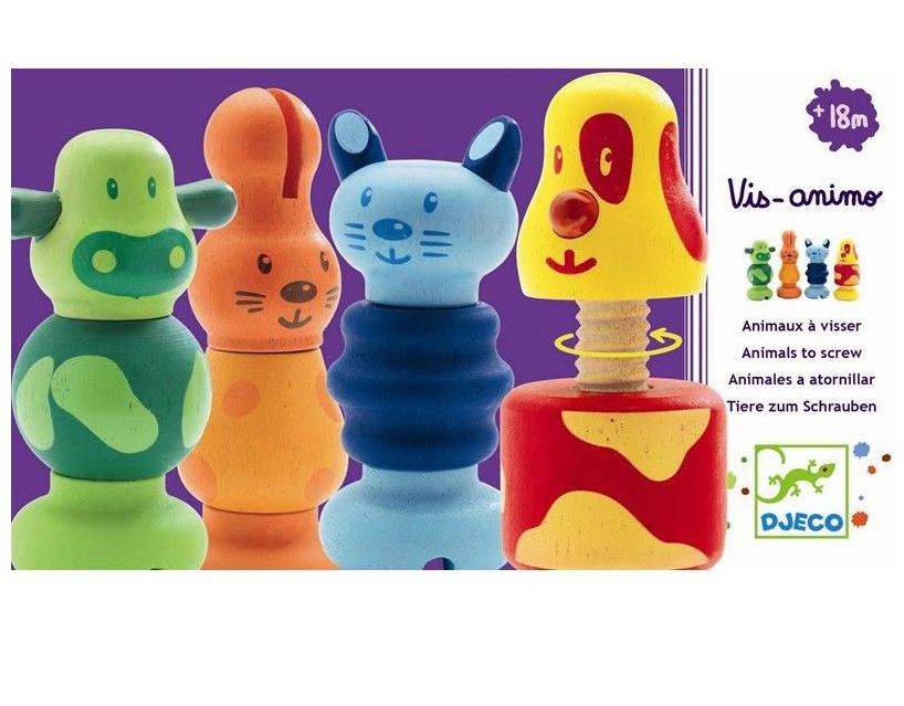 Pocieszne figurki zwierzątek drewnianych. Bardzo ładnie wykonane, kolorowe, zachęcające do zabawy. Każde zwierzątko składa się z trzonka i trzech części, które jak śrubki nakręca się na trzonek. Zabawne zajęcie dla maluszka, ćwiczy sprawność rączek, sprzyja skupieniu, intryguje, spodoba się małym majsterkowiczom.