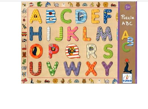Drewniane puzzle - alfabet. Walory edukacyjne:rozpoznawanie liter, wiek dziecka : 2 lata + Wymiary: 41,5 x 29,7 x 1 cm