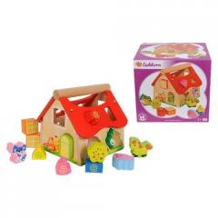 Domek edukacyjny wykonany z drewna, w zestawie kolorowe klocki o różnych kształtach. Dziecko w trakcie zabawy może umieszczać klocki - kształty do odpowiednich otworów.
