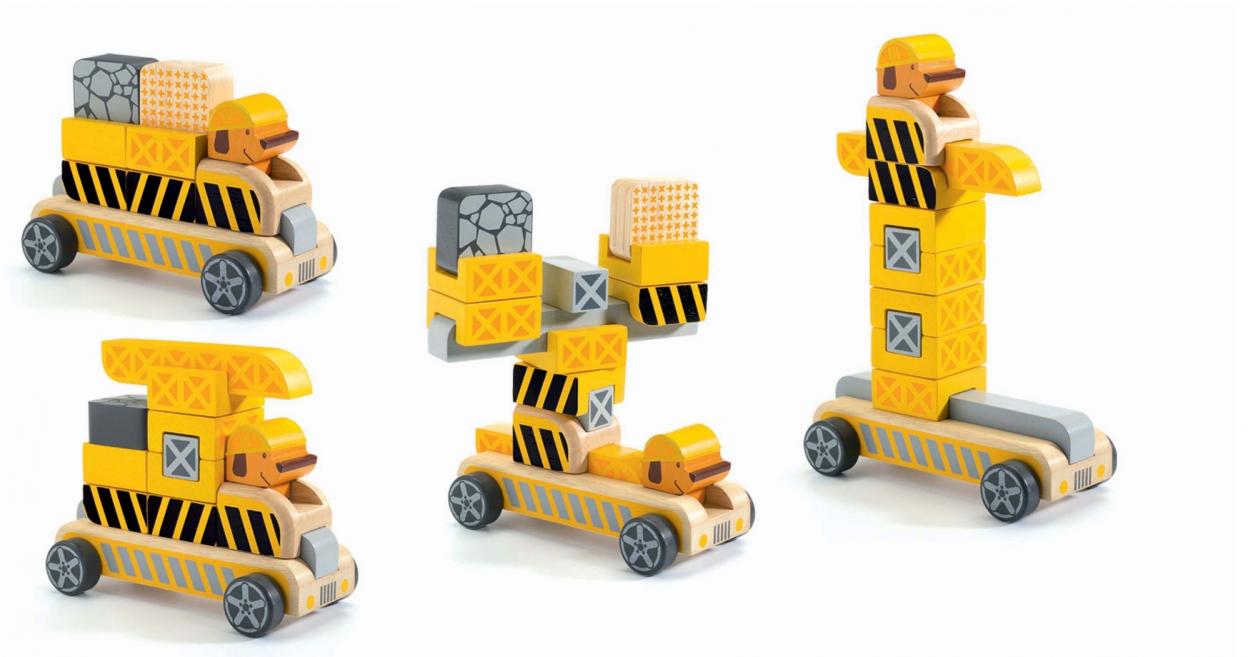 Drewniany Buldy Buldo z możliwością przekładania klocków tak aby powstały różne wersje. Wiek: 2+ 15 elementów Wymiary opakowania 20 x 15 x 8 cm