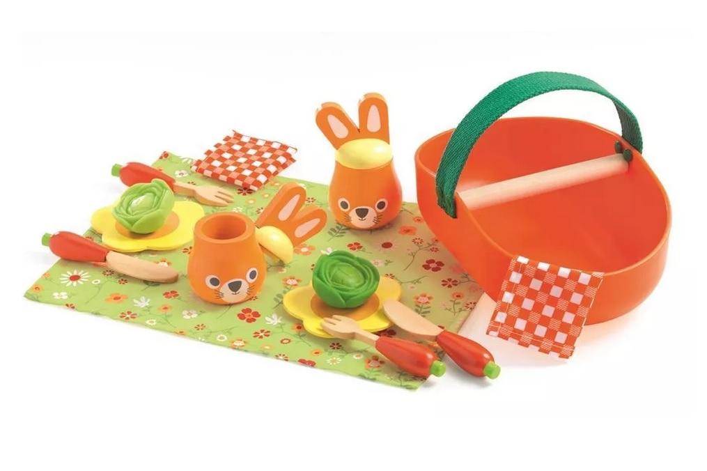 A colourful picnic set perfect for little hands. Includes 2 rabbit cups, 2 soft plastic lettuces, 2 plates, 2 sets of chunky knives and forks, a plastic picnic basket with fabric handle, 2 napkins and a picnic blanket. Design Christophe Gilet Box 29.5 x 18.5 x 10cm