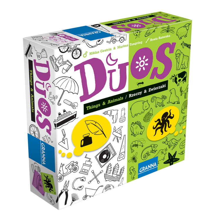 W ""DUOS"" liczy się kreatywność oraz umiejętność przywidywania skojarzeń pozostałych uczestników rozgrywki. Szybkie rundy i masa ciekawych rozmów nad stołem to właśnie ""DUOS"", towarzyska gra, która sprawdzi się zarówno w gronie rodziny, jak i znajomych. Jednocześnie na rynku zadebiutują dwa pudełka. Każde zawiera 2 kategorie i wszystko co potrzebne jest do zabawy. Zawartość obu można połączyć!