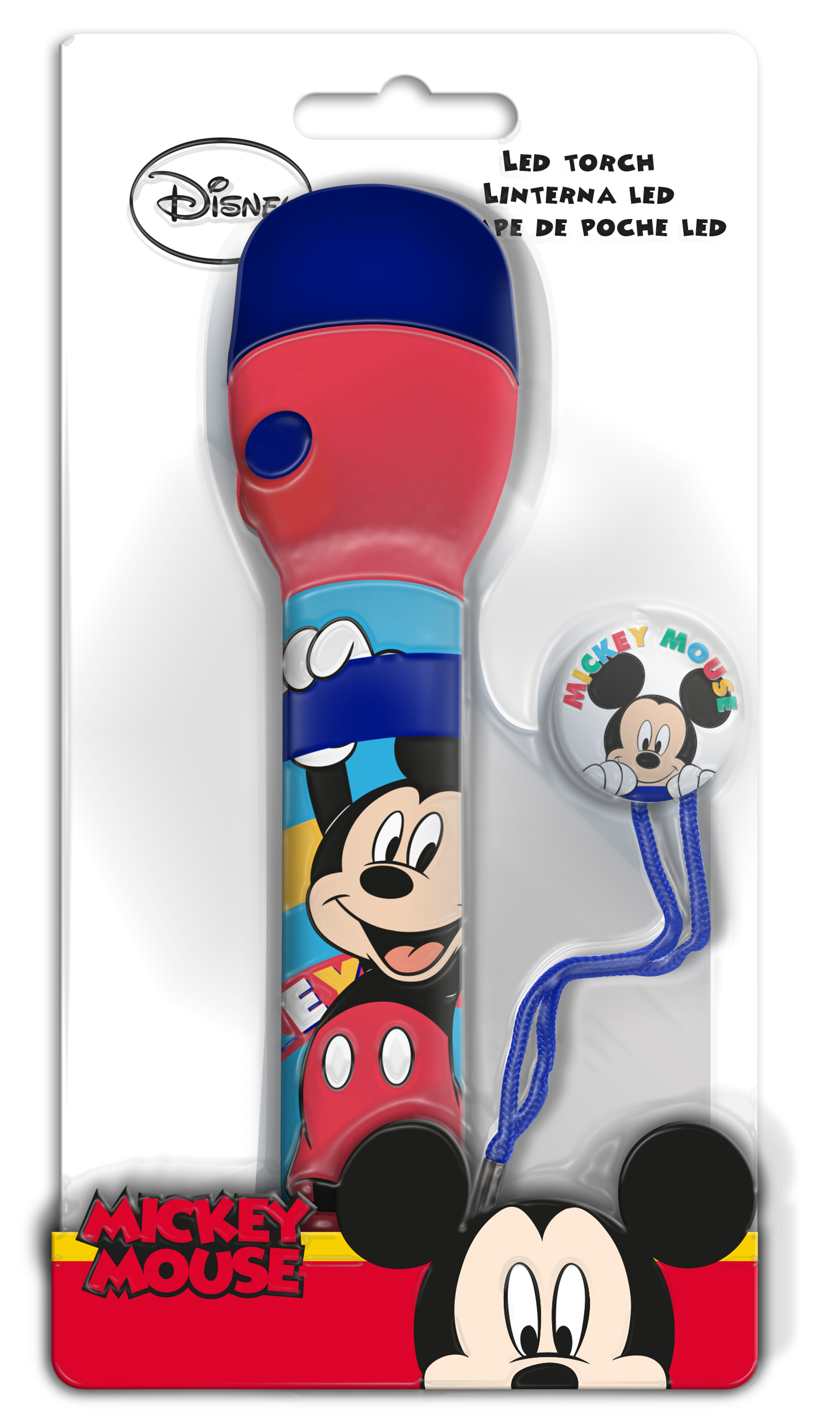 Poręczna latarka LED ozdobiona wzorem z Myszki Mickey.