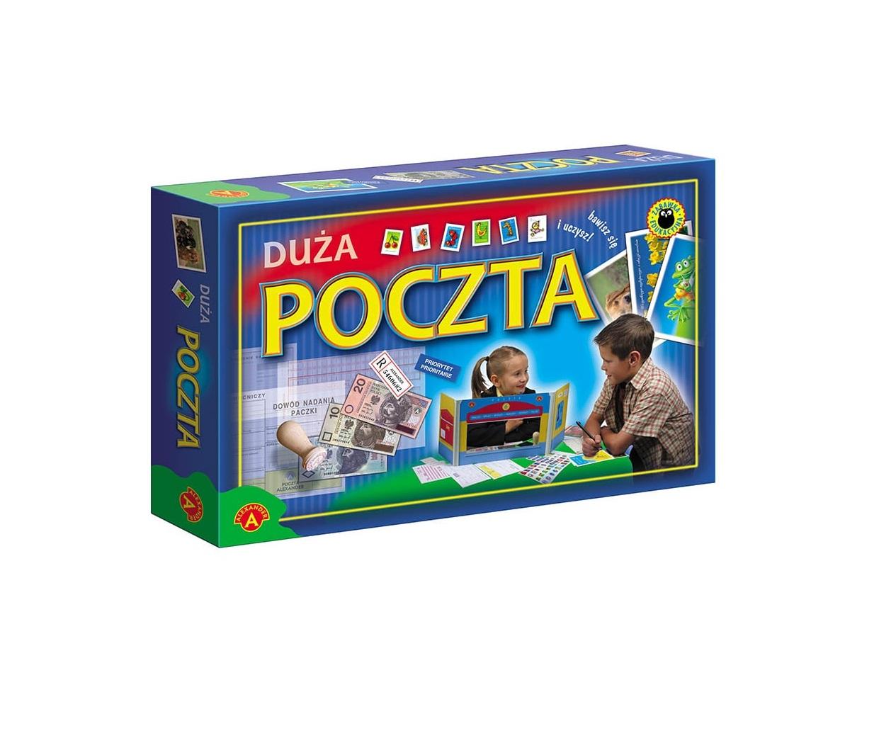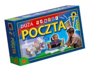To znakomita zabawka edukacyjna. Składa się na nie wiele atrakcyjnych rekwizytów związanych z pracą na poczcie. Bawiąc się w pocztę dzieci poznają zasady adresowania listów i pocztówek. Dowiedzą się jak wypełnić druk na przekaz bankowy lub wpłatę gotówkową, czy też adres pomocniczy na list polecony. Te i inne czynności sprawią, że dzieci poznają na czym polegają usługi świadczone przez pocztę. Zawartość pudełka: okienko pocztowe, 5 nominałów po 12 sztuk, pieczątka z poduszką dwukolorową, bilon, 18 pocztówek, 10 kopert, 88 znaczków, druki pocztowe.