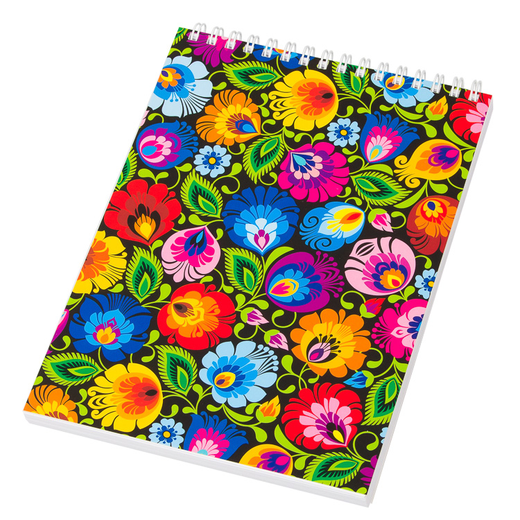 Notesy stylizowane na ludowo w oryginalne łowickie kwiaty. Wewnątrz na kartkach miniaturki folk kwiatów z łowickich wycinanek w trzech wersjach kolorystycznych. 70 kartek.
