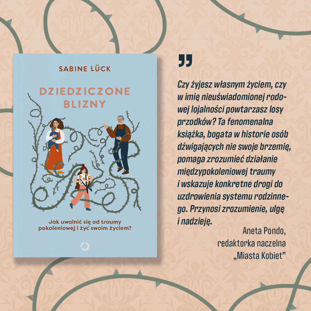 Często nie zdajemy sobie sprawy z tego, że przodkowie obarczyli nas swoimi zmartwieniami, troskami i przeżyciami, które wpływają na to, jak traktujemy siebie i innych. Niektóre blizny „pokrywają” naszą rodzinę od kilku pokoleń i niezależnie od podejmowanych przez nas działań, nie chcą zniknąć. Posłuchaj swojego wewnętrznego głosu i poznaj historię swojej rodziny. Zrozum ją i zaakceptuj, a następnie uwolnij się od traum, które oplatają twoje życie niczym korzenie. Sabine Lück jest psychoterapeutką i specjalistką od radzenia sobie z traumami pokoleniowymi. Opracowała unikalny, kompleksowy program samoleczenia. W tym przewodniku udziela cennych wskazówek, jak poznawać historię swoich przodków. Odpowiada na pytania dotyczące dziedziczenia traum pokoleniowych i zachęca do ćwiczeń, dzięki którym zrozumiesz swoje życie. Udowadnia, że zbieranie informacji o losach rodziny jest istotne dla osobistego rozwoju. Dzięki tej książce dowiesz się, na ile to, co wydarzyło się w twojej rodzinie, definiuje ciebie. Sabine Lück jest psycholożką, psychoterapeutką dzieci i młodzieży oraz terapeutką rodzin. Prowadzi własną praktykę. W 1994 roku wraz z terapeutką Ingrid Alexander opracowała Generation Code®, innowacyjną metodę terapii traumy pokoleniowej. W 2010 roku obie terapeutki założyły Institut für Transgenerative Prozesse w Wendeburgu. Lück dzieli się swoją rozległą wiedzą na wykładach, seminariach i szkoleniach. Pomysł na tę książkę zrodził się w 2002 roku, podczas podróży do Namibii, gdzie autorka dorastała. W wieku 15 lat przeprowadziła się do Niemiec, tu mieszka i pracuje do dziś.