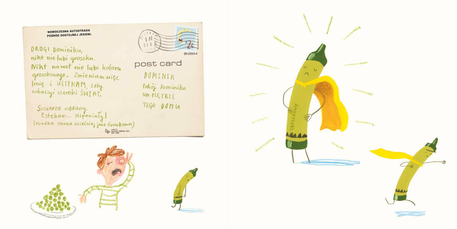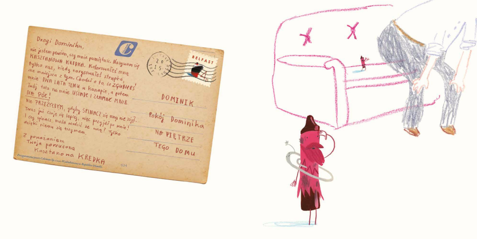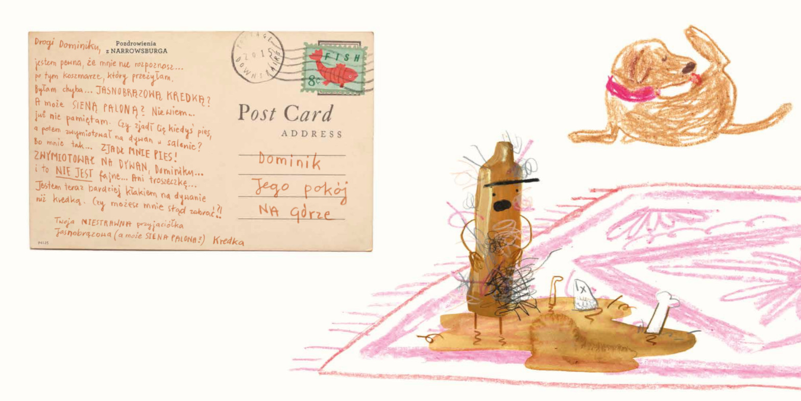 Kredki Dominika to z pewnością barwna grupa oryginałów! Dopiero co chłopcu udało się ukoić zranione uczucia tych, które groziły odejściem, a już staje w obliczu nowego problemu – kredki potrzebują pomocy. Od Kasztanowej, która zaginęła pod poduchami kanapy, a do tego złamała się na pół, gdy usiadł na niej tata, po Turkusową, której głowa przykleiła się do jednej ze skarpetek Dominika, gdy razem wylądowali w suszarce. Każda z kredek ma smutną historię i prosi, aby zanieść ją do domu, do pudełka. Autor i ilustrator ponownie połączyli siły, aby kolejny raz stworzyć zabawną i przyjazną dzieciom historię. Kontynuacja książki „Dzień, w którym Kredki miały dość”.
