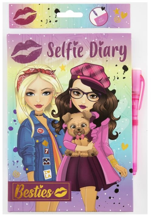 Pamiętnik selfie 21 x 15 cm i magiczny długopis (który widać tylko przy pomocy specjalnego światła lampki zawartej także w długopisie). Wewnątrz 50 różowych kartek A5 w linię. Dostępne dwa warianty, z różowym lub fioletowym długopisem. Przeznaczony dla dzieci powyżej 5 roku życia.