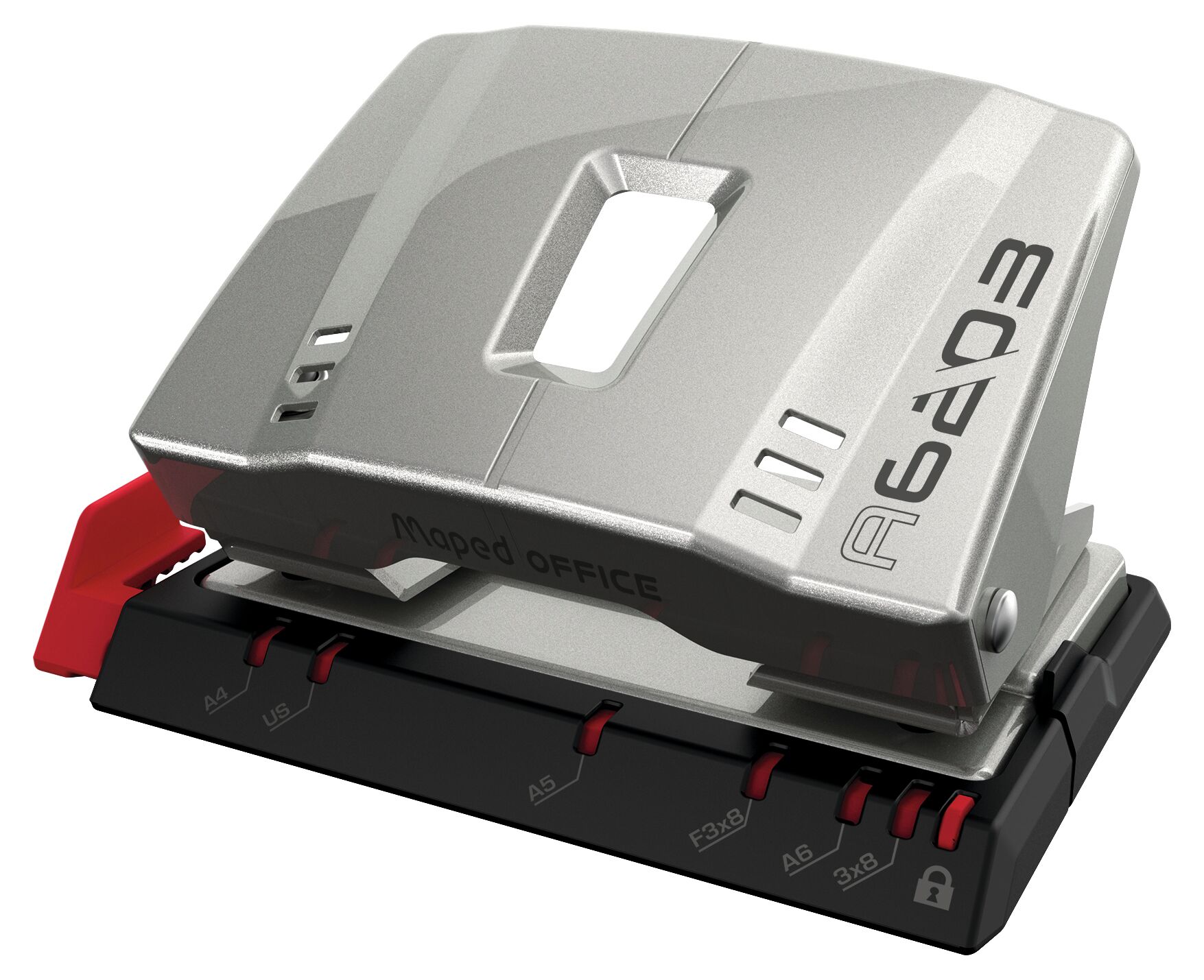 Nowoczesna profesjonalna seria biurowa wyprodukowana z najlepszej jakości materiałów przy zastosowaniu najwyższej technologii do 25 kartek. metalowy mechanizm i obudowa precyzyjne stalowe ostrza pozwalają dziurkować minimalizując niezbędny wysiłek precyzyjny ogranicznik formatu z podglądem wyraźnie oznaczonego formatu: A4, US, A5, F3x8, A6, 3x8 wgłębienia w tylnej części podstawy zgodne z rozstawem ringów w segregatorze umożliwiają szybkie dziurkowanie bez użycia listwy formatowej wskaźnik środka strony łatwy do otwierania pojemnik na ścinki odległość między dziurkami 8 mm średnica dziurek 5,5 mm opakowanie dostosowane graficznie do prezentacji w poziomie na półce i w pionie na hakach. Kolor srebrny metalicznyGwarancja 10 l. JS 1 szt.