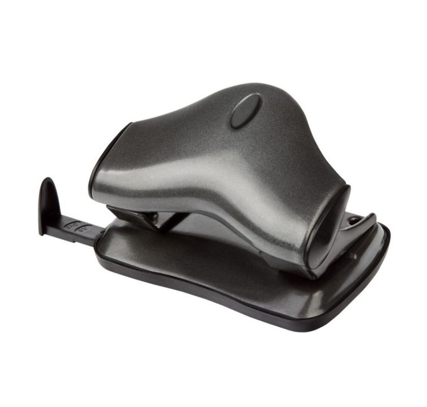 metalowy dziurkacz z antypoślizgowym elementem na ramieniu pojemnik na odpady z tworzywa sztucznego nierysującego podłoża listwa formatowa wskaźnik środka strony dziurkuje do 10 kartek średnica dziurki 6 mm rozstaw dziurek 80 mm gwarancja 3 lata