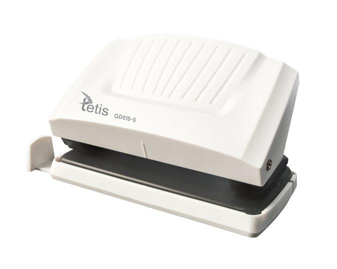 Dziurkacz z tworzywa sztucznego. Części mechaniczne metalowe, wskaźnik środka strony, ogranicznik formatu. Dziurkuje do 12 arkuszy. Opakowanie: pudełko PP.