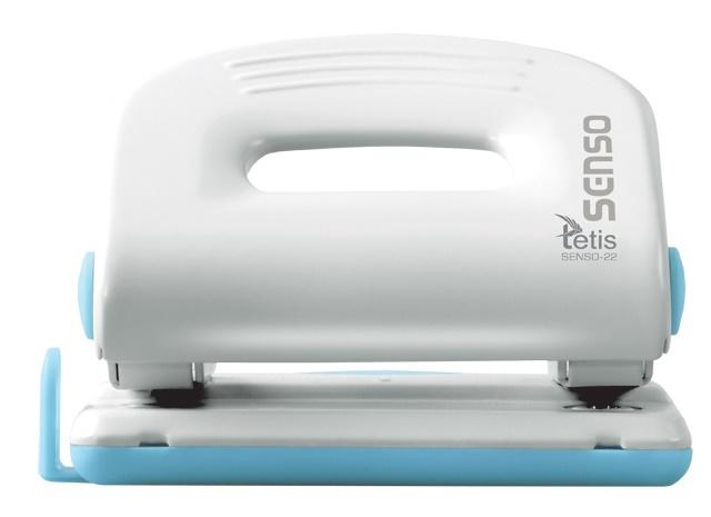 Metalowy dziurkacz biurowy z wykończeniami z tworzywa sztucznego. Kolor niebieski. Posiada wskaźnik środka strony i ogranicznik formatu. Dziurkuje do 25 arkuszy. Średnica otworu 6 mm. Rozstaw dziurek 80 mm. Głębokość wsuwania kartek 12 mm. Nowatorskie rozwiązanie umożliwia usunięcie konfetti bez zdejmowania całego spodu.