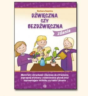 Publikacja ""Dźwięczna czy bezdźwięczna"" składa się z dwóch części: pierwsza służy do ćwiczeń na etapie wyrazu, druga - na etapie zdania. Prezentowany w tej części materiał przeznaczony jest do ćwiczeń utrwalających poprawną wymowę i różnicowanie spółgłosek będących w opozycji dźwięczna - bezdźwięczna w zdaniach, a także do usprawniania techniki czytania i pisania. Ćwiczone głoski to: w-f, z-s, ż(rz)-sz, ź(zi)-ś(si), dz-c, dż-cz, dź(dzi)-ć(ci), b-p, d-t, g-k.Ponadto opracowane ćwiczenia mają na celu: kształtowanie poprawnej wymowy, doskonalenie umiejętności układania zdań, eliminowanie błędów wynikających z wady wymowy, popełnianych w czytaniu i pisaniu, rozwijanie funkcji percepcyjno-motorycznych.Materiały przeznaczone są dla dzieci w wieku przedszkolnym i uczniów z młodszych klas szkoły podstawowej. Wiele z ćwiczeń jest przydatnych w pracy z uczniami starszymi, którzy nie opanowali poprawnej wymowy bądź przejawiają trudności w czytaniu i pisaniu. Publikacja może być wykorzystana jako pomoc dydaktyczna przez logopedów, terapeutów, nauczycieli oraz rodziców.Materiały zawierają: 33 plansze z kolorowymi obrazkami (każdy obrazek do pocięcia na 4 części) przedstawiającymi różne sytuacje oraz ze zdaniami stanowiącymi podpisy do tych obrazków, aneks z konturami kolorowych obrazków do kolorowania przez dzieci młodsze, rozsypanymi wyrazami z lukami literowymi do uzupełnienia i ułożenia oraz liniaturą do zapisania zdań.