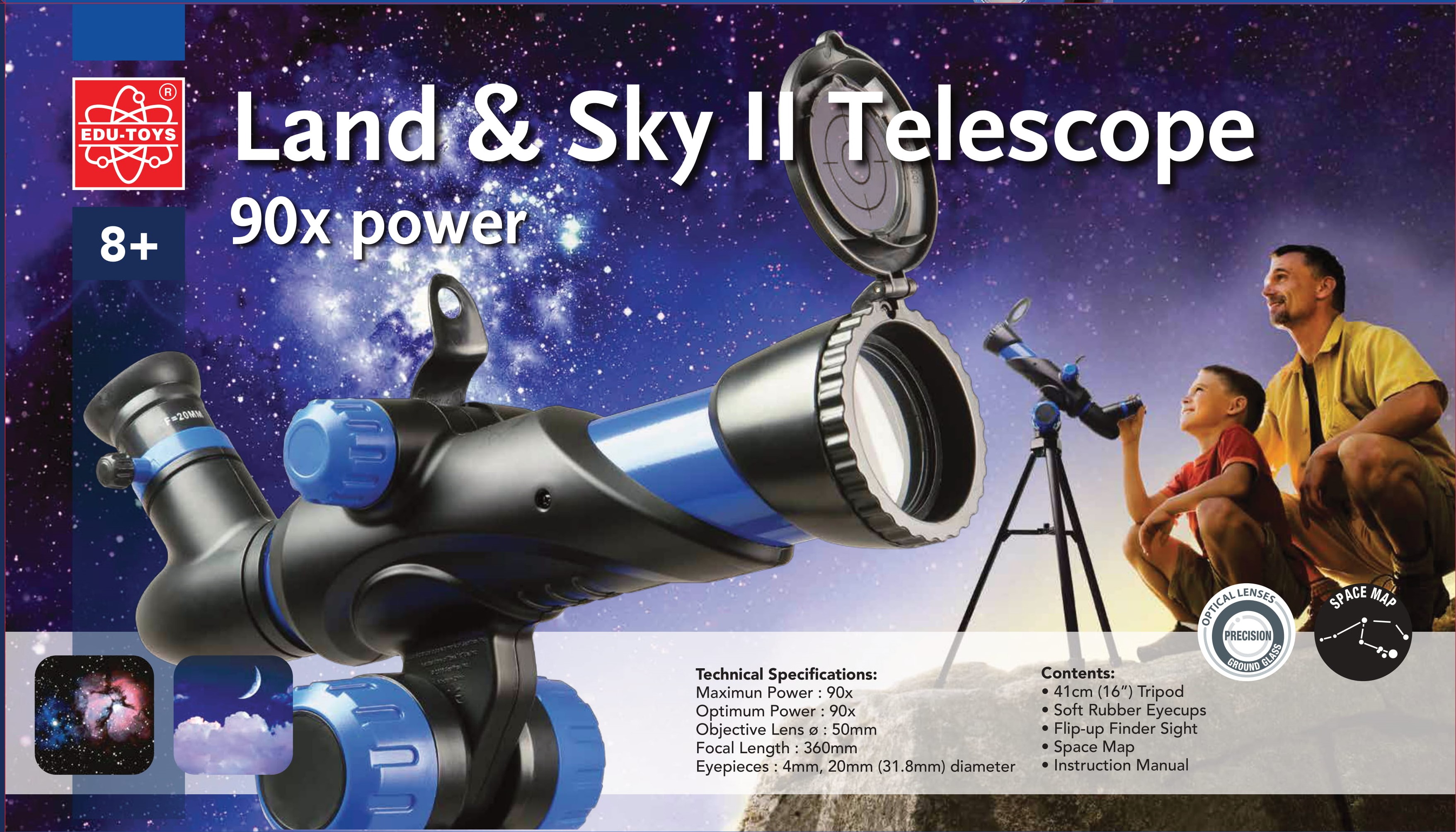 Teleskop Land & Sky z aluminiowym statywem Za pomocą teleskopu Edu-Science TS779 Land & Sky II możemy zobaczyć obiekty, które są obecne daleko w kosmosie, a także w krajobrazie lądowym. Teleskop Edu-Science TS779 Land & Sky II ma 16-calowy statyw, który utrzymuje go w miejscu i zapewnia stabilność oraz zapobiega niechcianemu ruchowi teleskopu . Statyw umożliwia też łatwe śledzenie obiektów niebieskich, które wydają się poruszać po niebie przez prostą regulację. Parametry: Maksymalna moc powiększenia wynosi 90x, a optymalna moc 90x. Soczewka obiektywu 50 mm zbiera światło pochodzące z obserwowanego obiektu i skupia promienie, aby uzyskać prawdziwy obraz. Teleskop ma ogniskową 360 mm, która zapewnia czysty, kontrastowy widok ciemnych obiektów. Miękkie gumowe muszle oczne poprawiają komfort oglądania i zapobiegają wpływowi światła rozproszonego na obraz. Jest wyposażony w trzy okulary o średnicy 4 mm, 20 mm i 31,8 mm. Jest również wyposażony w funkcję celownika, mapę kosmiczną i instrukcję obsługi.