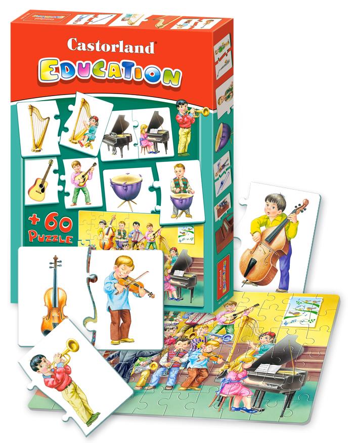 Castorland Education - to seria edukacyjnych układanek, które poprzez zabawę pozwalają dzieciom na poznanie alfabetu oraz poszerzenie słownictwa języka polskiego i angielskiego. Wprowadza je do magicznego świata liczb i działań artmetycznych, pomaga w zdobyciu umiejętności posługiwania się zegarem oraz rozwinięciu zdolności kojarzenia. Produkty te zostały opracowane zgodnie z aktualną wiedzą dydaktyczną, uwzględniając poziom rozwoju psychofizycznego oraz możliwości percepcyjne i manualne małych ""naukowców"" Instrumenty - prosta logiczna układanka to świetna okazja do wprowadzenia w świat muzyki. Prezentuje maluchom instrumenty muzyczne i pokazuje jak wydobyć z nich dźwięk. Dodatkową atrakcją zabawki są puzzle 60 -cioelementowe ""MałaOrkiestra"".