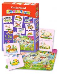 Castorland Education - to seria edukacyjnych układanek, które poprzez zabawę pozwalają dzieciom na poznanie alfabetu oraz poszerzenie słownictwa języka polskiego i angielskiego. Wprowadza je do magicznego świata liczb i działań artmetycznych, pomaga w zdobyciu umiejętności posługiwania się zegarem oraz rozwinięciu zdolności kojarzenia. Produkty te zostały opracowane zgodnie z aktualną wiedzą dydaktyczną, uwzględniając poziom rozwoju psychofizycznego oraz możliwości percepcyjne i manualne małych ""naukowców"" Wesołe podwórko - zestaw puzzli dwuelementowych oraz pięknie ilustrowanych puzzli 30 elementowych ""Wesołe Podwórko"". Zadaniem dziecka jest połączyć kolorowe, sympatyczne zwierzęta w pary według modelu ""mama i dziecko"". Odpowiednie wycięcia umożliwiają ocenę poprawności.