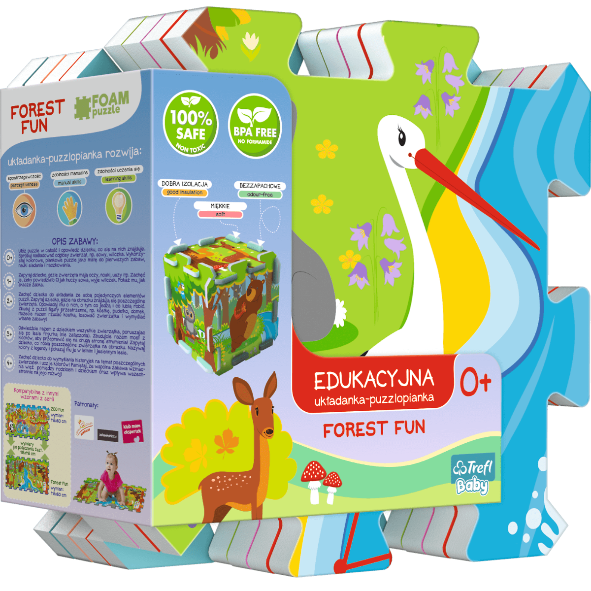 Puzzlo-pianki to duże, miękkie, kolorowe puzzle, z których można budować figury przestrzenne, np. kostkę lub pudełko. Mogą również posłużyć jako podkładka przy innych zabawach. Puzzlo-pianki można łatwo myć.
