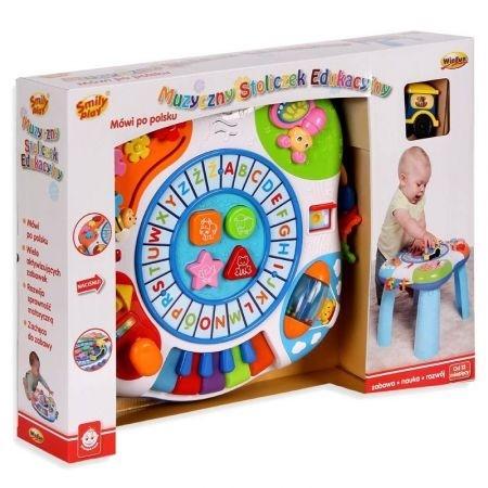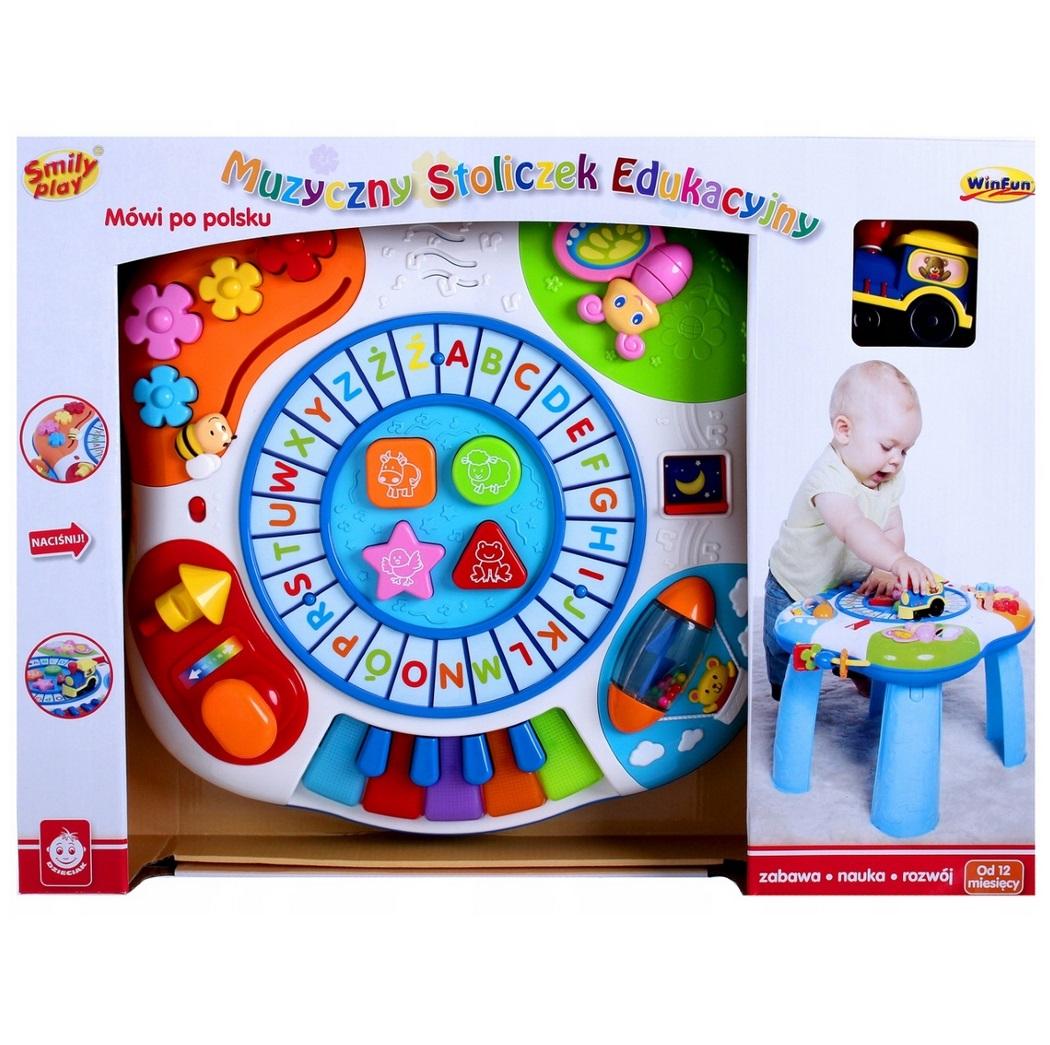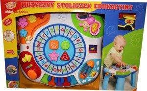 Stoliczek zachęca do aktywności. Każda dołączona zabawka wymaga wykonania jakiejś czynności (naciskania, popychania, przekręcania....). I każda czynność zostaje nagrodzona: stoliczek zagaduje do dziecka, nazywa obrazki, kolory, kształty, wydaje dźwięki, gra melodyjki, miga światełkami....