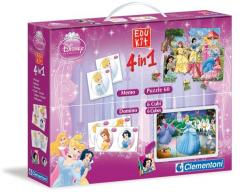 Zestaw Clementoni Edukit 4 w 1 Princess.Zestaw składa się z puzzli, klocków, memo oraz domino.W zestawie znajdują się 2 rodzaje układanek: puzzle składające się z 30 elementów oraz klocki- 6 kostek z których można ułożyć obrazki.Do zestawu dołączono również 2 gry: Memo i Domino w tej samej tematyce.